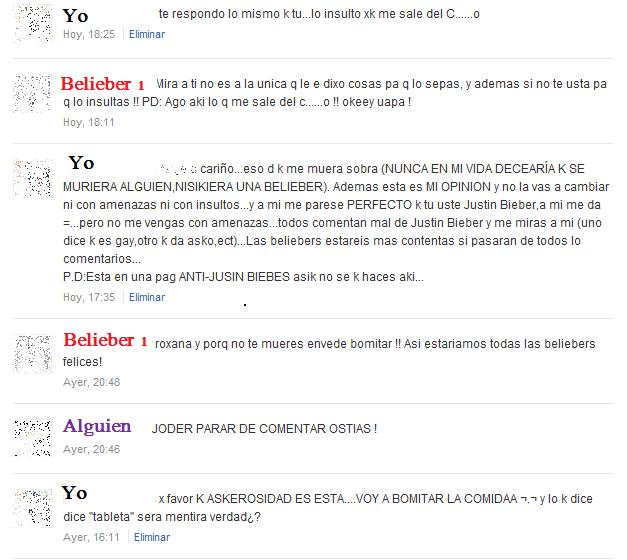 Como ya sabéis yo no soporto al Justin.B. y una belieber me dijo que me muriera,por que deje lo que yo quise (saben que yo no me corto,y siempre dijo lo que pienso) ...espero que esa chica piense un poquito y elija a otra con quien meterce,porque conmigo lo tiene claro...Dije:"Que asquerosidad" por una foto de JB...